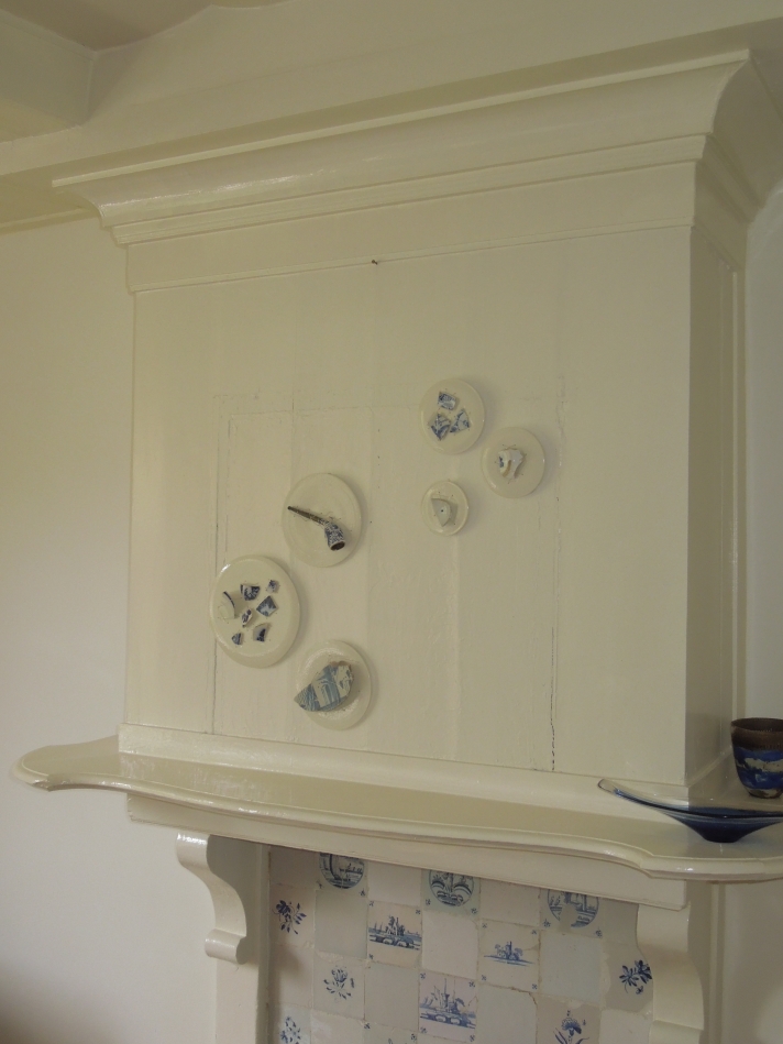We hadden haar gevraagd een tableau van keramiek te maken passend bij de Delftsblauwe tegels achter de schoorsteenmantel. En in plaats van een ‘zwaar’ geheel ( dat zou immers zo maar kunnen met keramiek ) is het een flexibele en bijna transparantie compositie geworden.