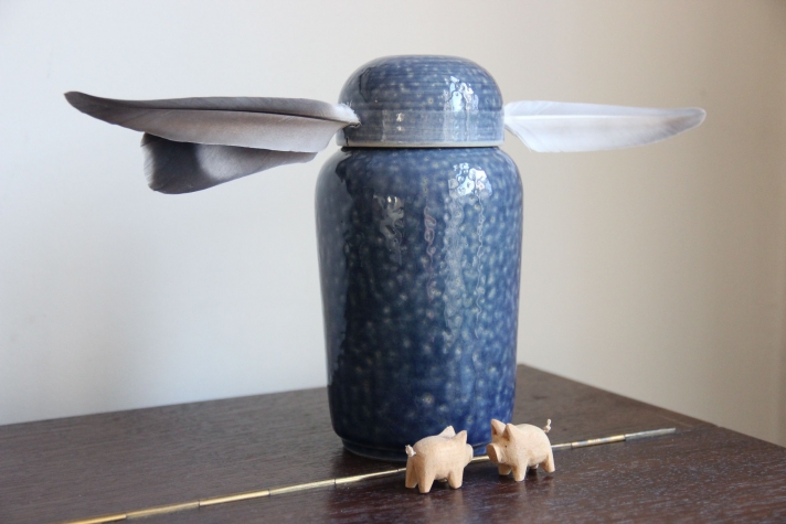 Met het eindresultaat ben ik erg blij. Ik kijk er elke dag even naar of leg m’n handen even om de herinneringspot. De kleur blauw is echt zijn kleur. De duivenveertjes die ik in de loop van de tijd heb meegenomen zonder dat ik eigenlijk wist waarom, hebben nu ook een plek. Dit is voor mij een belangrijke stap geweest.